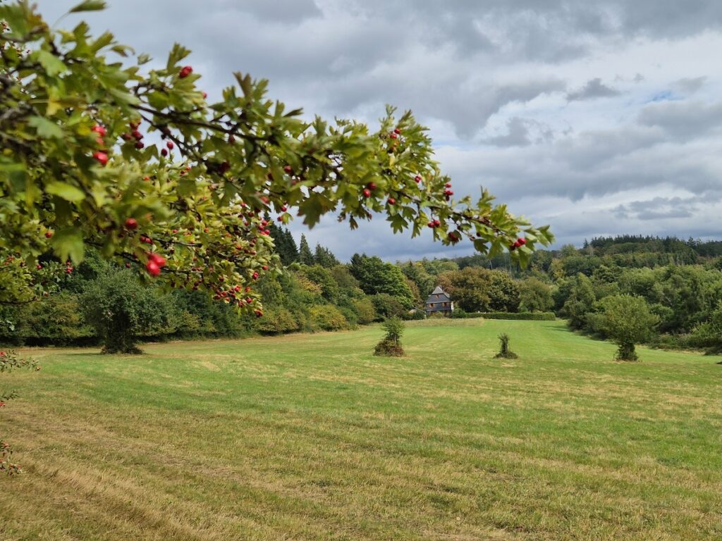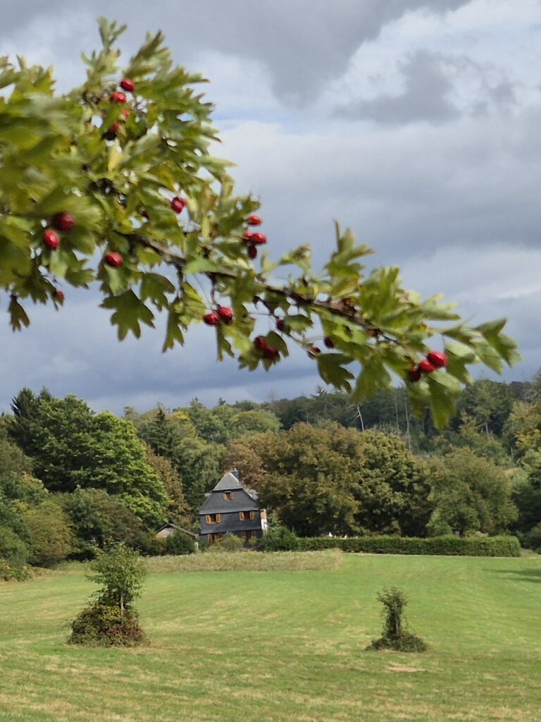 Chronologie der Gebäude vor 1924 - 2025 Südansicht vor 1924 (ältestes Foto) Südansicht vor 1924: Scheunen- und Stallkomplex, Fachwerk-Schweinestall im Hintergrund. Die Südansicht des Backes, vor 1924. Südansicht vor 1924, Wohnhaus mit Fachwerkstall (Foto Familie Stoffels). Gebäudekomplex vor 1924. Blick von den unteren Wiesen (Foto Familie Klauer). um 1924, mit Revierförster Hubert Stoffels Südansicht um 1934 nach der Renovierung, mit 7 Stoffels-Kinder (Foto Franz Kreiling). 1935, Walter und Erich Stoffels auf der Eingangstreppe (Basalt). Im Hintergrund das Fachwerkhäuschen. (Foto Fam. Stoffels) Blick nach Südosten 1955, Scheune und Sumpfgebiet (Foto Familie Dreymann). Nordwestansicht 1958, Wohnhaus mit Backes (Foto Familie Dreymann) Ostansicht 1958, mit Fachwerkstall, Holzschuppen und neuer Stall (Foto Familie Dreymann). Südwestansicht 1959 unter Revierförster Hans Groß Zufahrt von Norden 1959 ohne Teerbelag Winter 1959 Südansicht Blick über die Weiden von Westen 1960, Ansichtskarte (Foto Hiller) Der "Wallfahrtsweg", Südansicht 1960. Blick von Südwesten 1960, untere Weiden werden später aufgeforstet. Der südwestliche Teil der Wiesen wird 1960 noch als Weidefläche genutzt. Förster Hans Groß mit Sohn Wolf-Jürgen 1962, Blick auf Hundezwinger, Garage mit Brunnen und Backes. Fuchsjagd 1963, mit Fachwerk-Stall und Holzschuppen. Fuchsjagd 1963, mit Blick auf den Backes aus westlicher Richtung. Wallfahrt 1965, mit Ansicht der Gebäude aus östlicher Richtung (Foto Familie Kuch). 1967, untere Wiesen sind bereits aufgeforstet, Backes und Fachwerk-Stall sind abgerissen (Foto Familie Kuch). Blick vom Südwesten 1967 (Foto Familie Kuch) 1969, Forsthaus mit neuer Treppe, Haustür und Fenstern. 1969, Rückseite mit geschwungener Eichentür als Kellereingang von außen. 1975, Teleaufnahme vom Post-Sendeturm, Alarmstange (Foto H. Fuchs). 1976, Blick aus südlicher Richtung mit aufgeschüttetem Damm (Foto H. Fuchs). Zufahrt aus nördlicher Richtung im Frühjahr 1980. Sommer 1980, Blick aus südlicher Richtung. Winter 1981, der umgebaute Holzschuppen als Hundezwinger. Nach der Vollsanierung 1995 war die Westseite noch unverschiefert. 2019, neue Zufahrt aus nördlicher Richtung nach der Sanierung 1995. Später besinnt man sich der schützenden Wirkung des Schiefers an der Wetterseite des Gebäudes. Der Weg vom "Krummen Esel" zur Landshube nach dem radikalen Fichten-Abtrieb, Oktober 2020. Oktober 2020, Blick auf die Landshube aus östlicher Richtung. Oktober 2020, gigantische Mengen an gefälltem Fichtenholz aufgrund von Trockenheit und Borkenkäferbefall. Januar 2021, verschneite Kahlfläche mit östlichem Blick auf die Landshube. Landshuber Weiden im April 2021. Landshuber Weiden im Oktober 2022. Westseite der Landshube im September 2023 (Klaus Aßmann) Landshuber Weiden mit Bienenwiese 2023 (Klaus Aßmann) Östliche Blickrichtung im September 2023 (Klaus Aßmann) Stallkomplex aus östlicher Richtung (Klaus Aßmann) Westseite der Stallung (Klaus Aßmann) Einfahrt im September 2023 (Klaus Aßmann) Östliche Ansicht im Dezember 2022 (Klaus Aßmann) Landshuber Wiesen aus westlicher Richtung, August 2025 nach oben