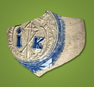 Eine kurtrierische Krugscherbe mit noch vorhandener Brennhilfe.