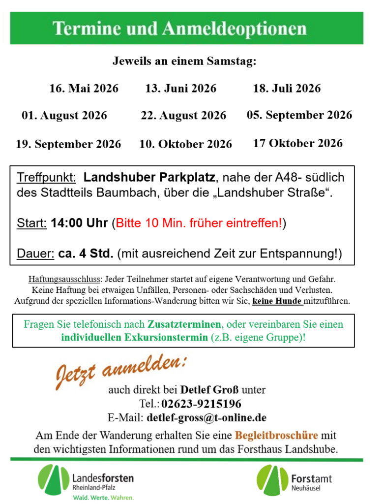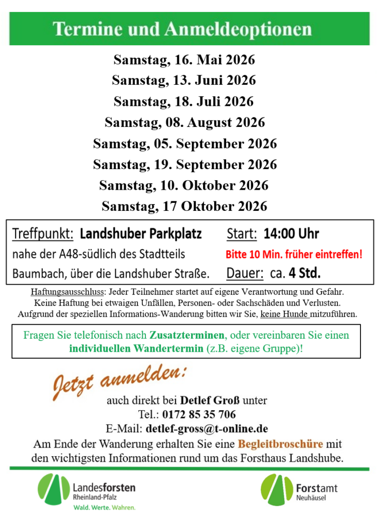Mehr als 500 Teilnehmer seit 2022 und die Vielfalt der ständig neuen Informationen, veranlassen das Forstamt Neuhäusel auch in 2026 geführte Exkursionen mit Detlef Groß anzubieten. Näheres hierzu sowie viele spannende Details, erfahren Sie während der abwechslungsreichen Wanderung mit Detlef Groß, Sohn des ehemaligen Forstbeamten Hans Groß und selbst einstiger Bewohner des Hauses. Er bereichert die Tour mit humorvollen Anekdoten und gibt Einblicke in die reiche und wechselvolle Geschichte des Forsthauses und des ehemaligen Hofguts Landshube, der gleichnamigen Weiher und der umliegenden Region. Zum Beispiel die sehr frühe Tätigkeit (15. Jh.) der Keramiker auf diesem Hof, oder die forstliche Pionierarbeit seines Vaters Hans Groß mit der Einführung exotischer Baumarten, als Zeugen seiner Vorstellung eines gemischten Waldbildes und vieles mehr. Immer wieder ergeben sich neue Aspekte, sei es Funde historischer Keramiken, die auf der Landshube produziert wurden, oder der erneute Besuch dreier Amerikaner, deren Vorfahren auf dem Hof Landshube geboren wurden und die 1843 in die USA auswanderten. Auch aktuelle Themen erläutert und demonstriert Detlef Groß, wie z. B. die neuen Wiederaufforstungs-Strategien rund um das Forsthaus Landshube.